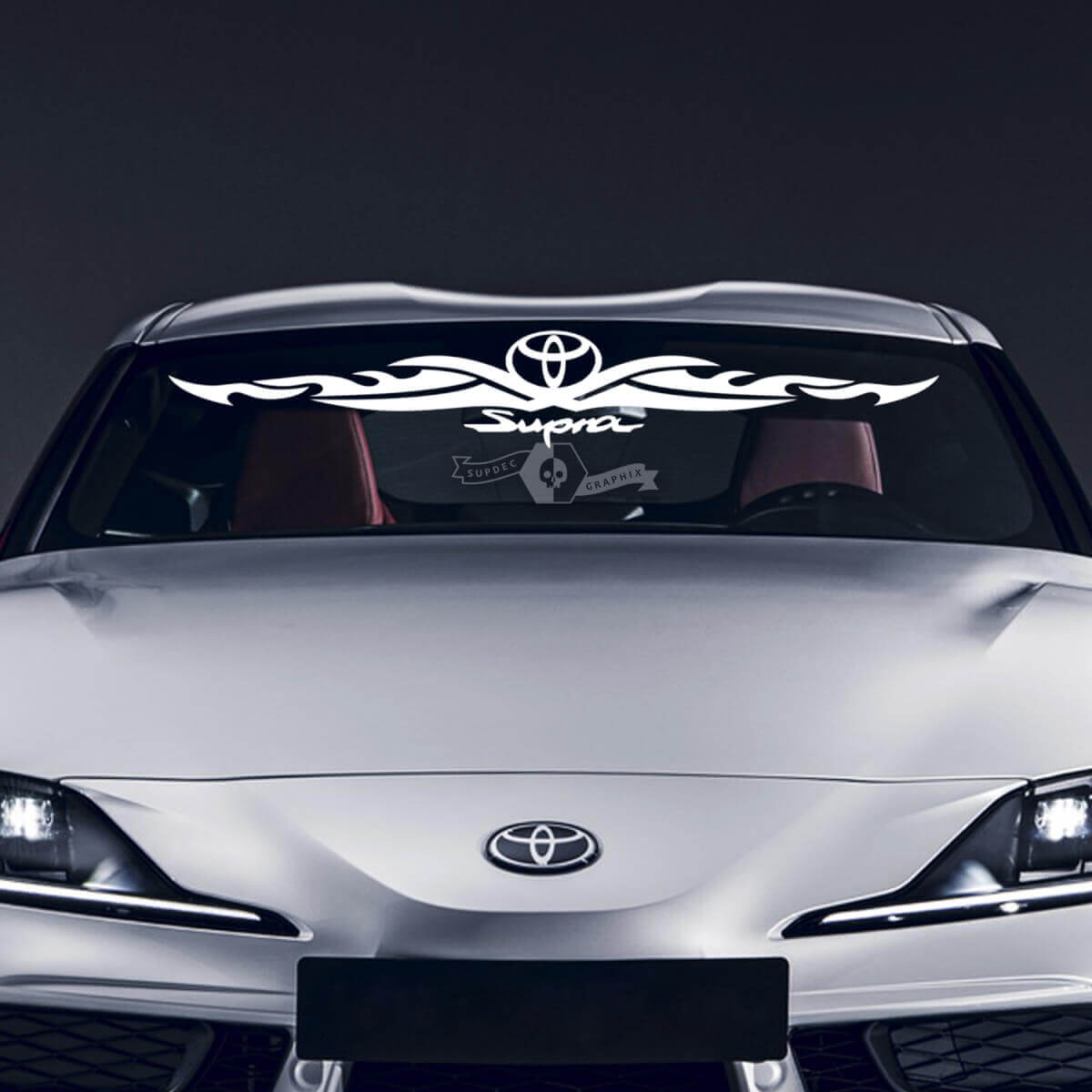 If you're bored driving your Toyota Supra Tribal, we know how to make your ride more than extraordinary. Our windscreen decals are specifically designed to make your car shine among the hundreds of others.