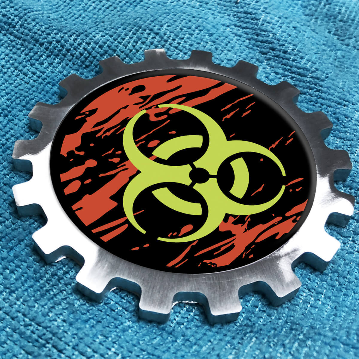 Perfect for fans of industrial or biohazard themes, this emblem ships worldwide including the USA, Canada, and Europe. Upgrade your style with a premium, eye-catching metal badge today.