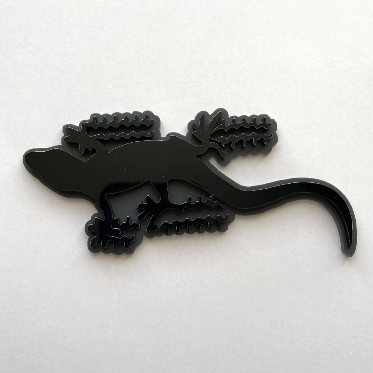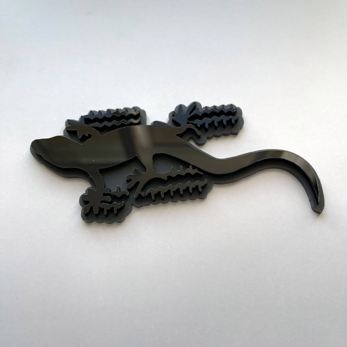 Enhance your vehicle's style with the Gecko 3D Badge Black vs Grey Fender Emblem. This high-quality vinyl decal features a striking gecko design in contrasting black and grey, adding a bold and dynamic look to your car's wing.