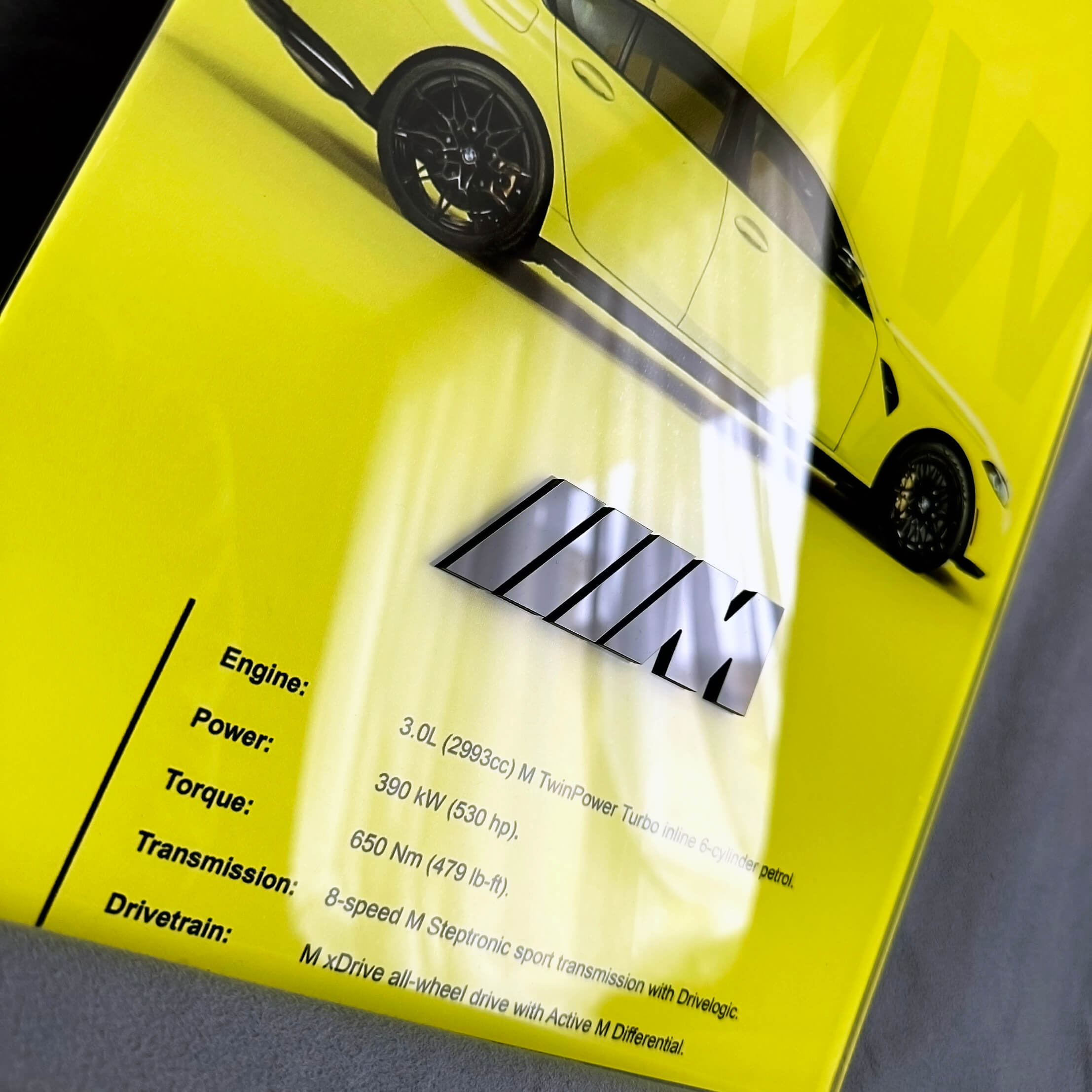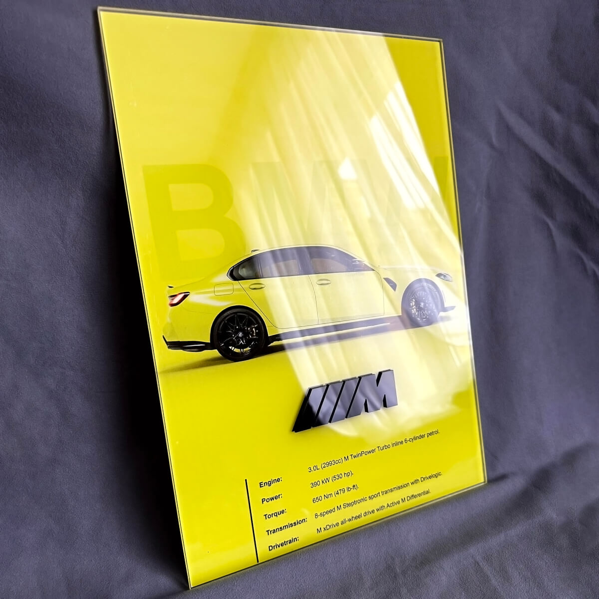 Enhance your garage or man cave with this BMW M3 G80 Glossy Acrylic Wall Art Panel. Designed for car lovers, it features a sleek, high-gloss finish that highlights the iconic BMW M3 G80 style.
