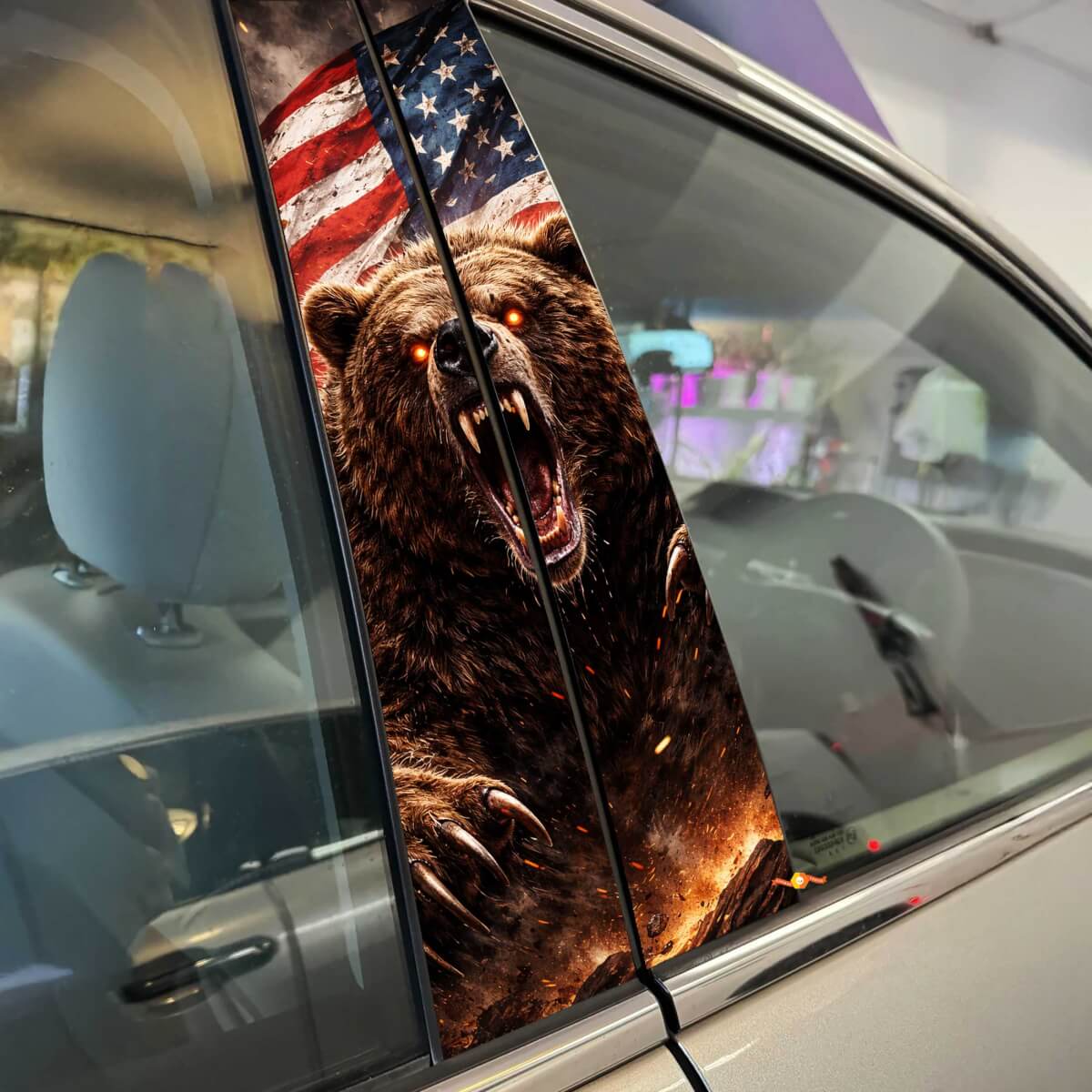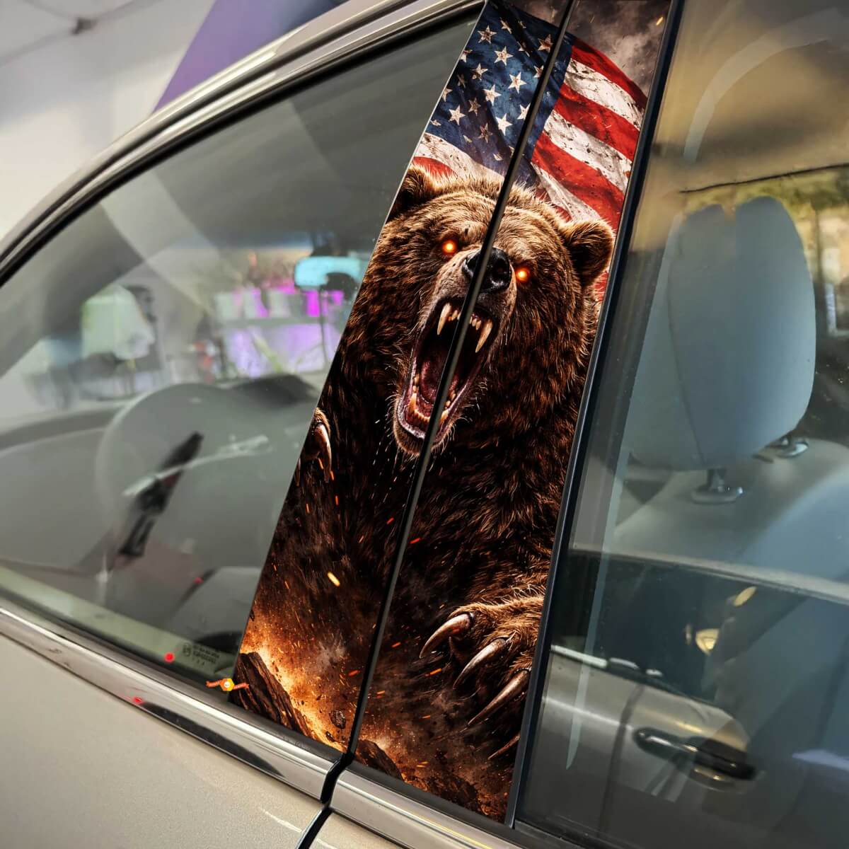 Enhance your vehicle's look with the Bear Rage American Flag Pillar Doors Vinyl Decal Sticker. This striking design features a powerful bear image combined with the iconic American flag, perfect for showcasing your patriotism and bold personality on your car's pillar doors.