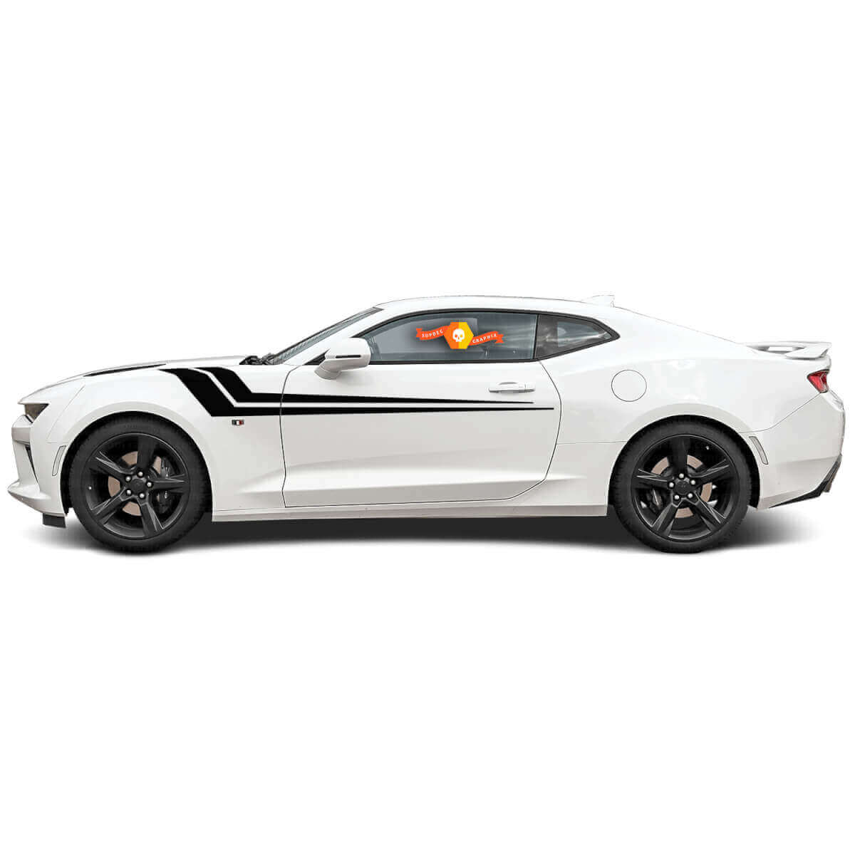 The original and only opportunity is only on our website for vinyl car decorations for all car models! We present you the original sticker on the front wing for installation on a Chevrolet Camaro car. The vinyl sticker is made of high-quality vinyl material and is installed closer to the front wing. The Camaro body sticker consists of two oblique stripes that start at the bonnet, bend and smoothly move along the car doors, reaching the rear. This design creates a dynamic and sporty look, emphasising the lines of your Camaro.
