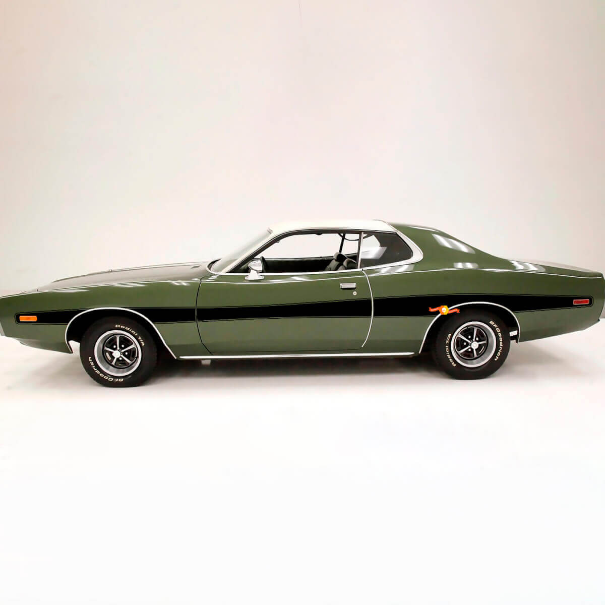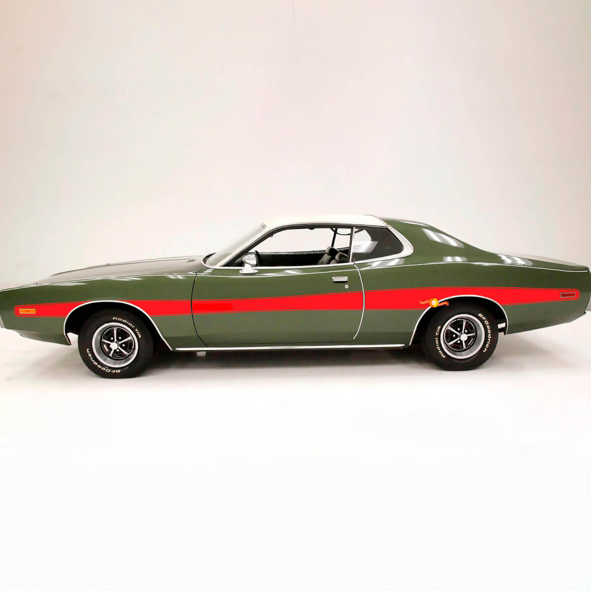 Enhance the vintage look of your 1973 Dodge Charger with these Side Retro Decals. These decals are designed to recreate the distinctive stripes found on classic muscle cars, adding authentic 1970s style and a genuine Mopar vibe to the side profile.